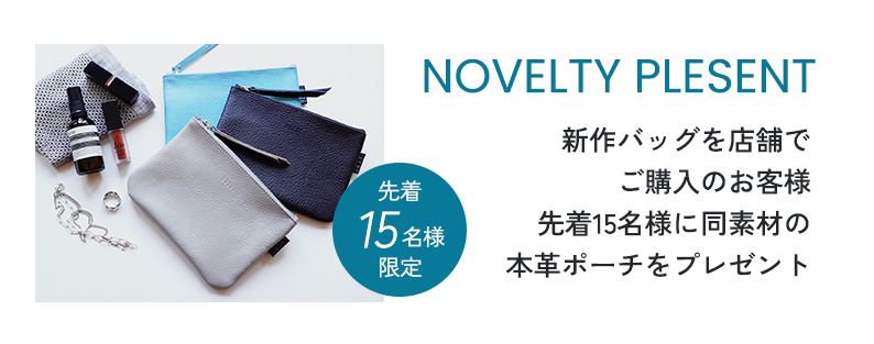 さらに、10月18日(土)より店頭で新作バッグをご購入いただいたお客様には、先着15名様限定で、同素材の本革ポーチをプレゼントいたします。